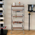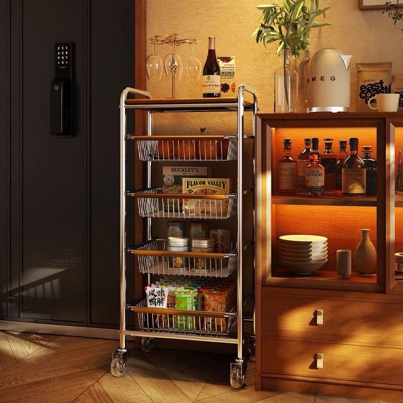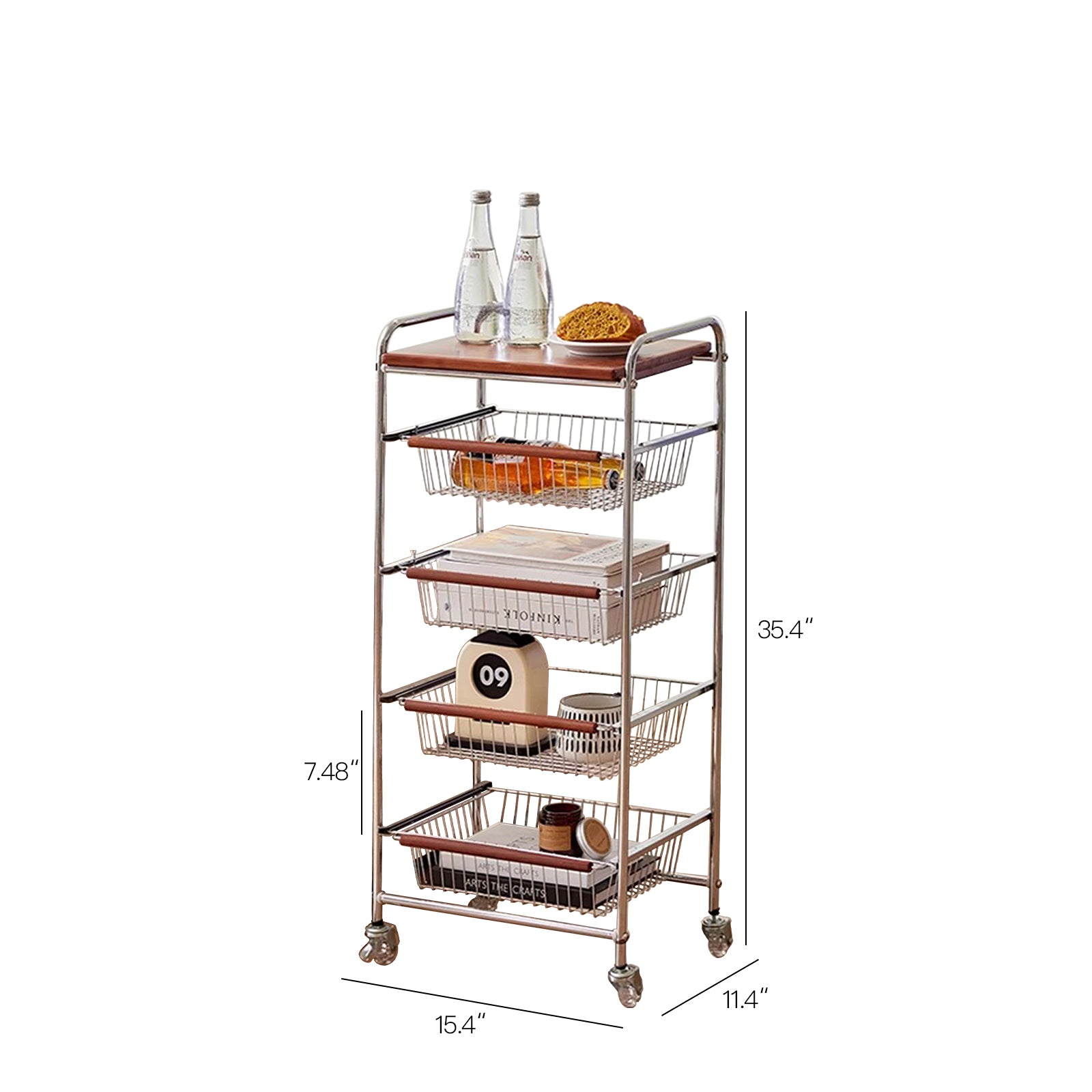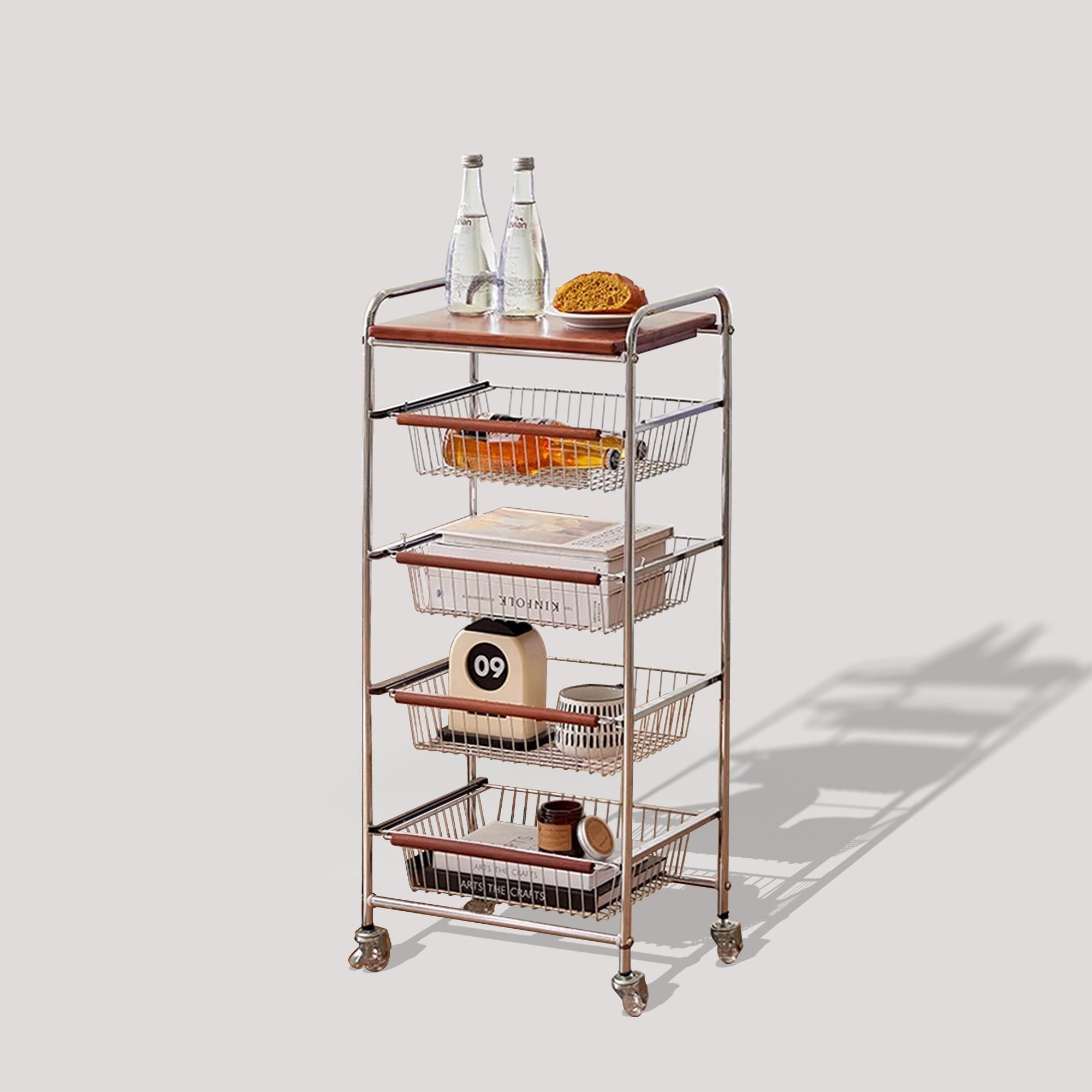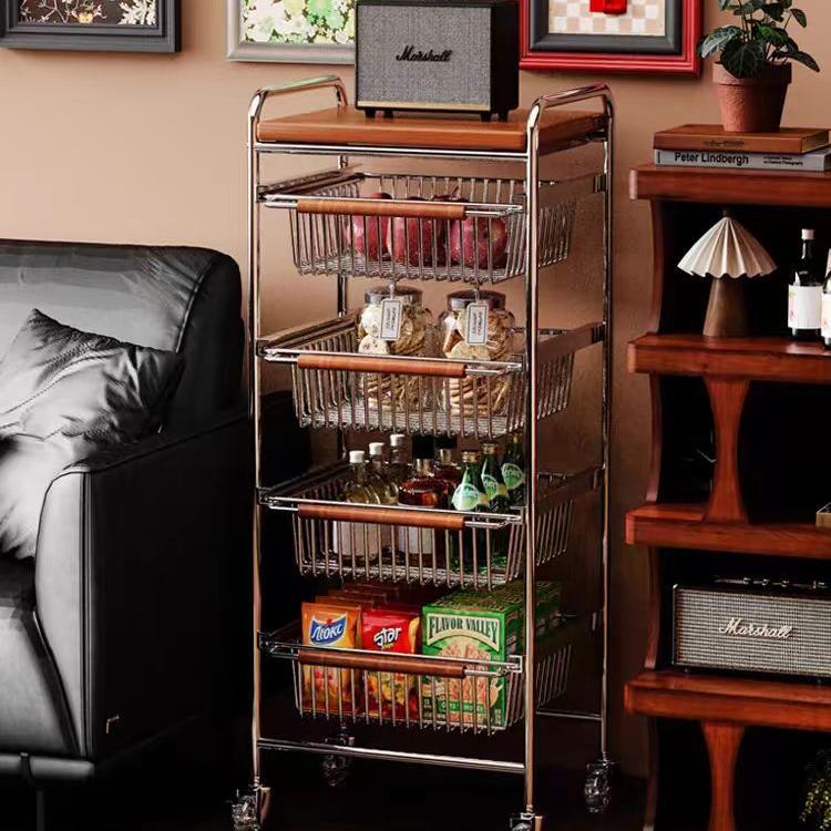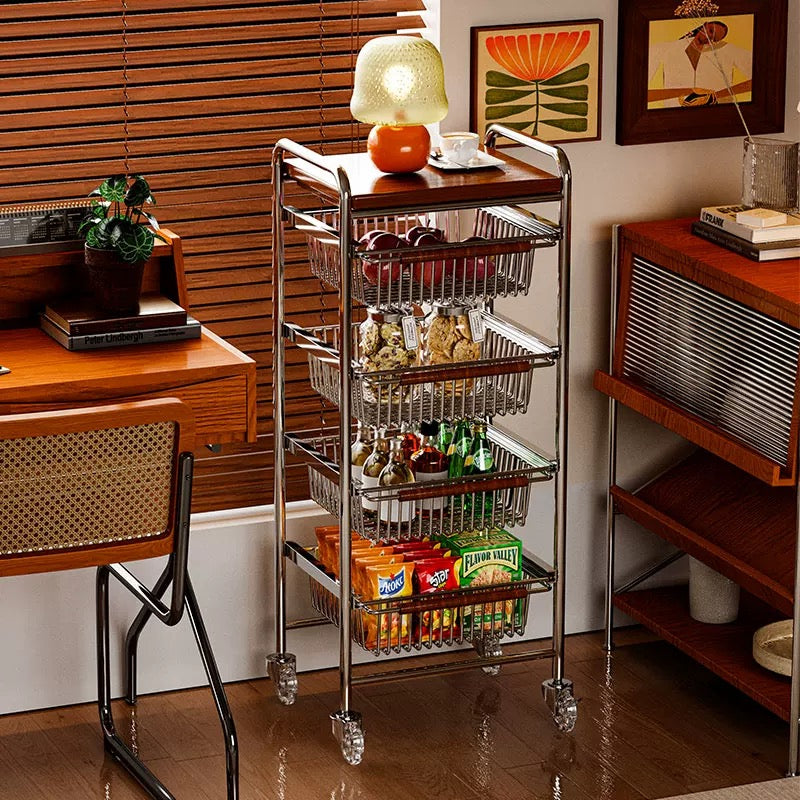 The perfect blend of style and function—say goodbye to clutter with this sleek storage cart.Crafted with removable solid wood panels and sturdy electroplated carbon steel, it offers durable elegance.Its multi-layer design maximizes space, while the pull-out basket ensures easy access. Ideal for small space, it keeps everything organized with ease.