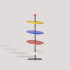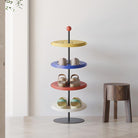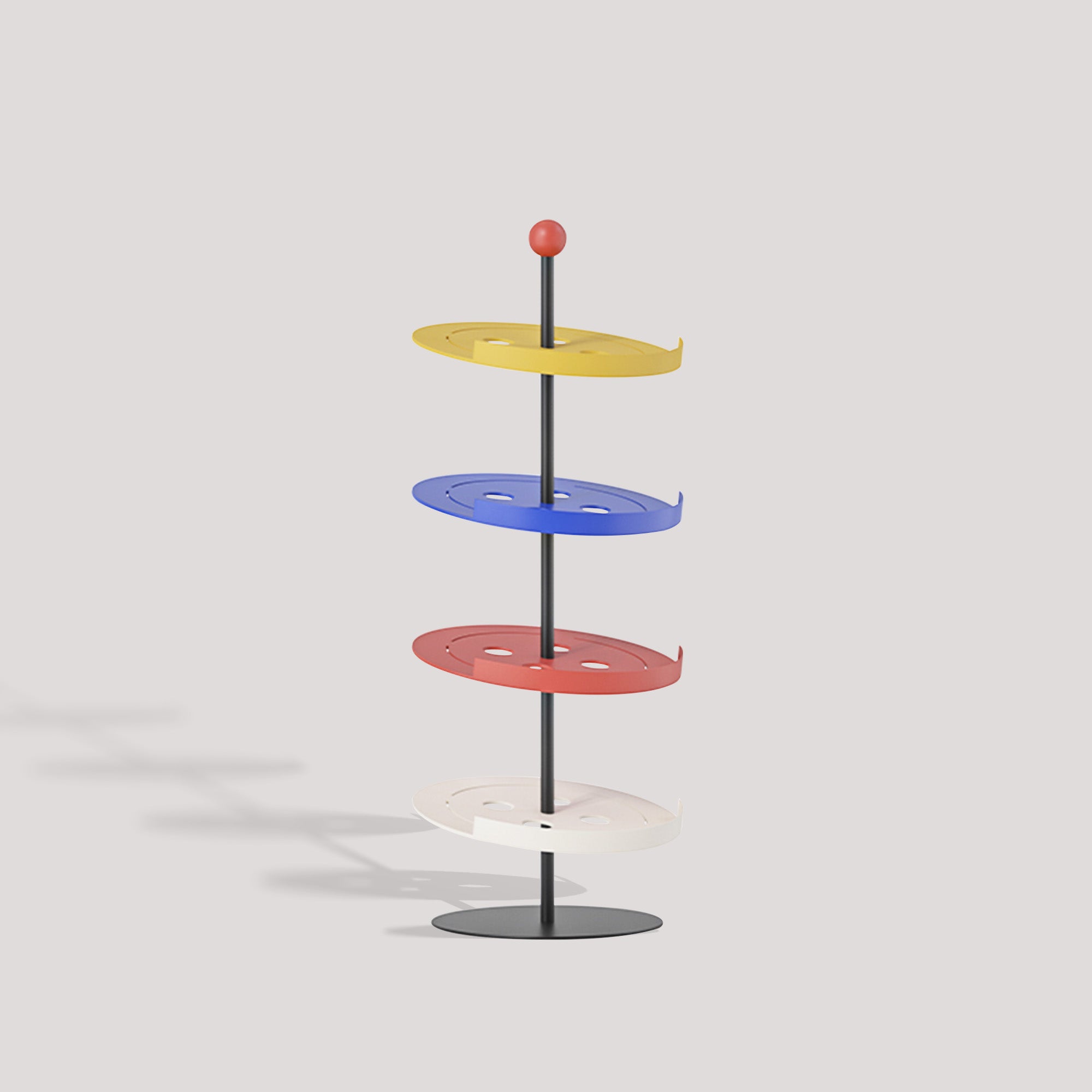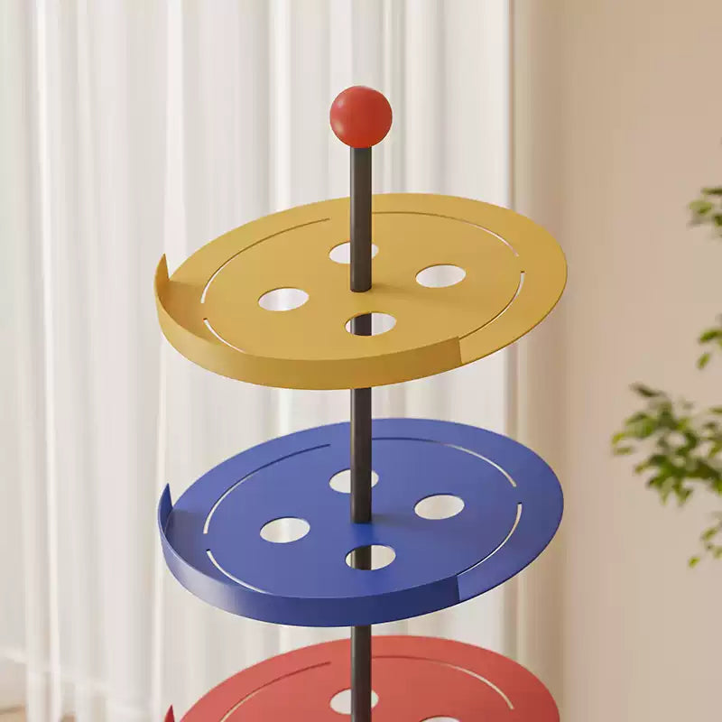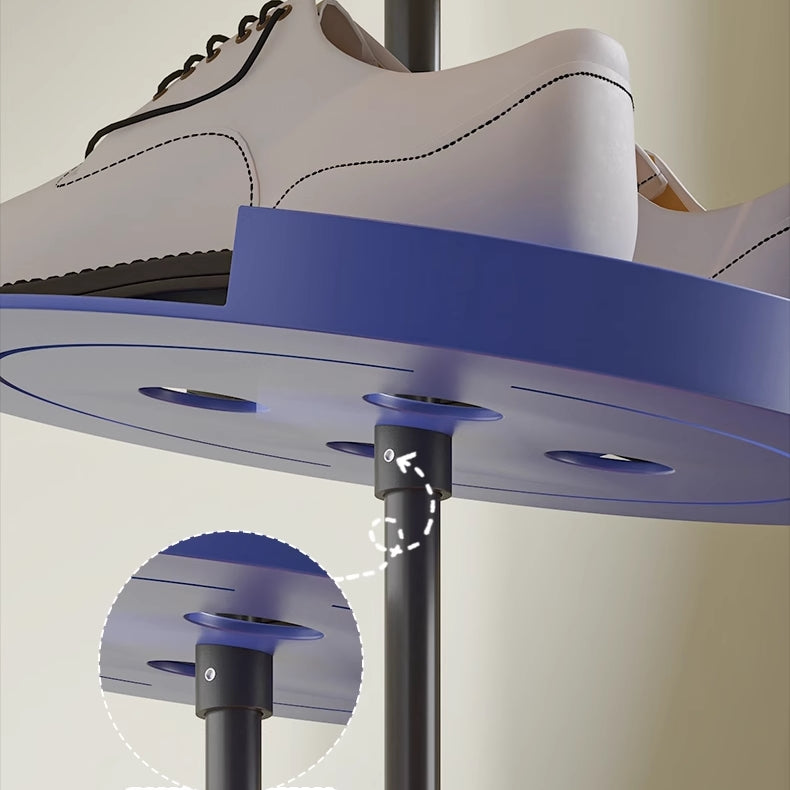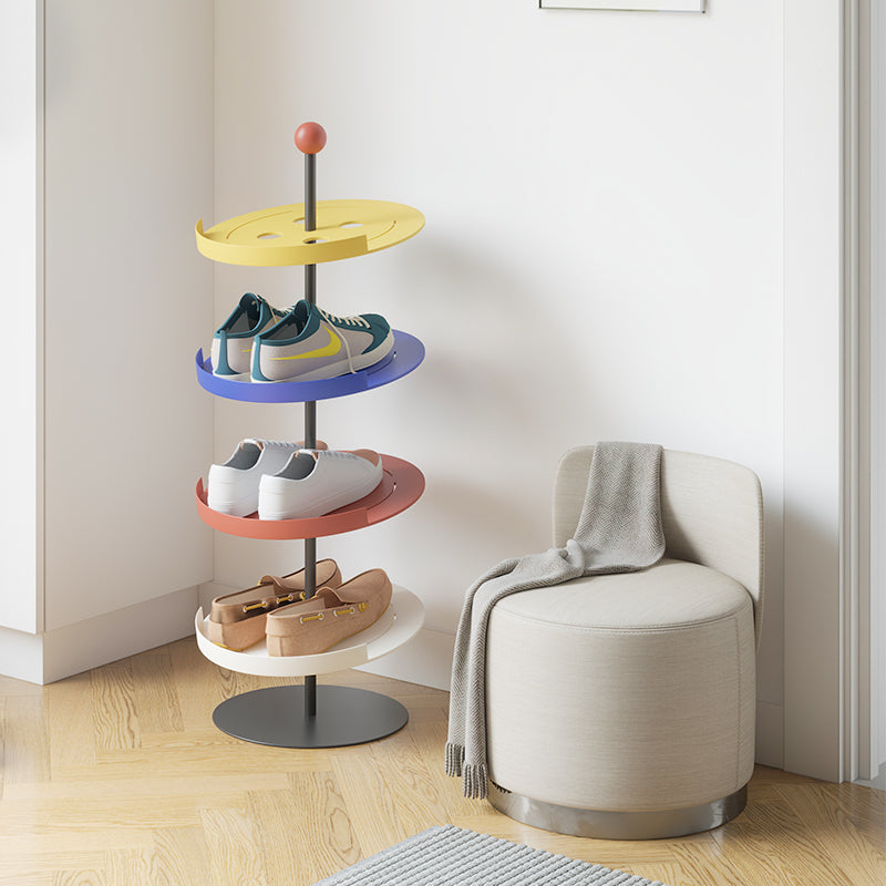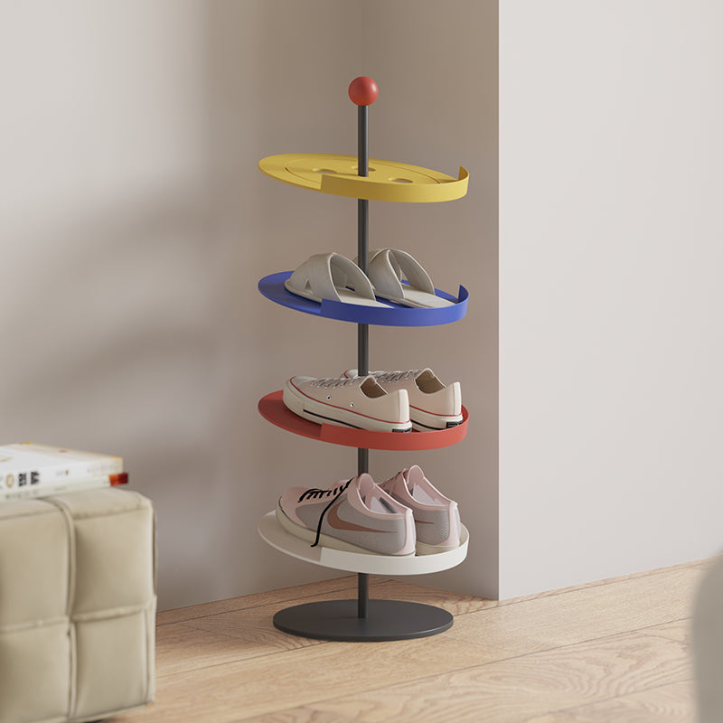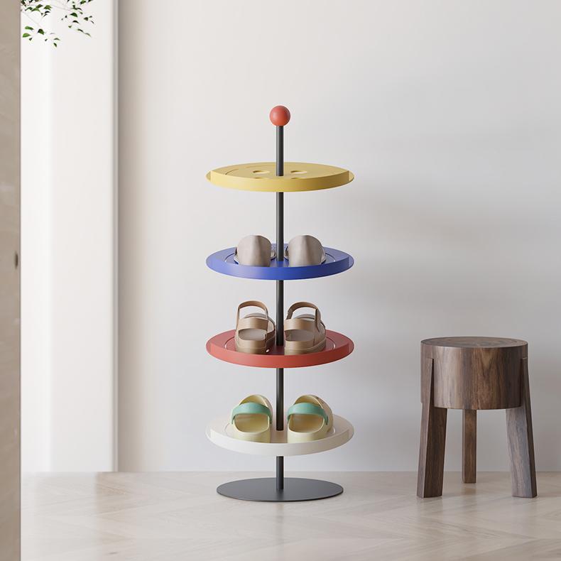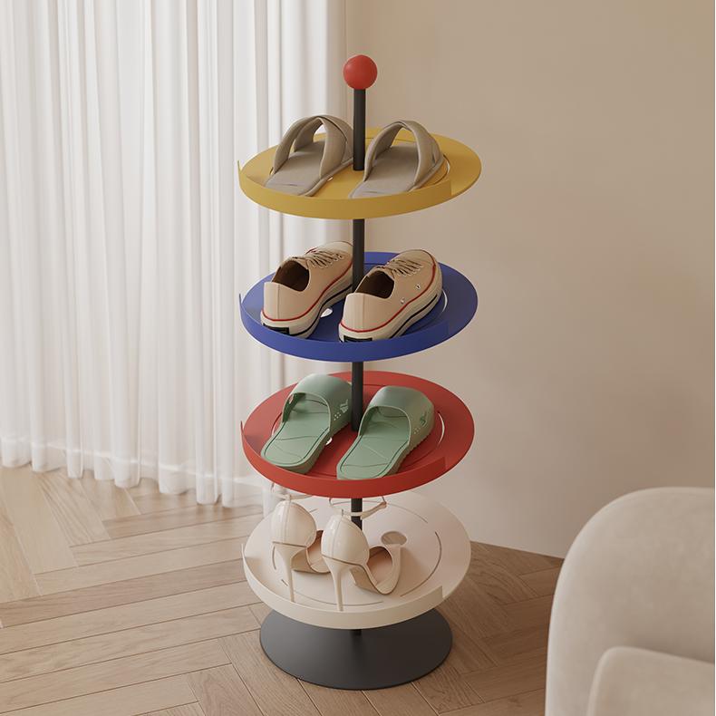 This modern shoe rack features round trays in contrasting colors, adding a stylish and vibrant touch to any room. Unlike traditional designs, it offers a fresh, artistic look that enhances your home decor. The trays are height-adjustable, allowing you to customize the spacing to accommodate different shoe sizes or storage needs. Its compact, vertical design makes it ideal for entryways, closets, or bedrooms, providing easy access while saving floor space.