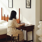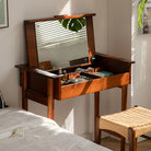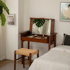 Made from rich rosewood and carbonized boxwood, this dressing table brings natural warmth and refined texture into your space. The flip-up mirror and thoughtful compartments keep your daily rituals organized, while the warm tones and fine wood grain create a calming, understated elegance. A quiet companion for serene mornings and soft evenings.